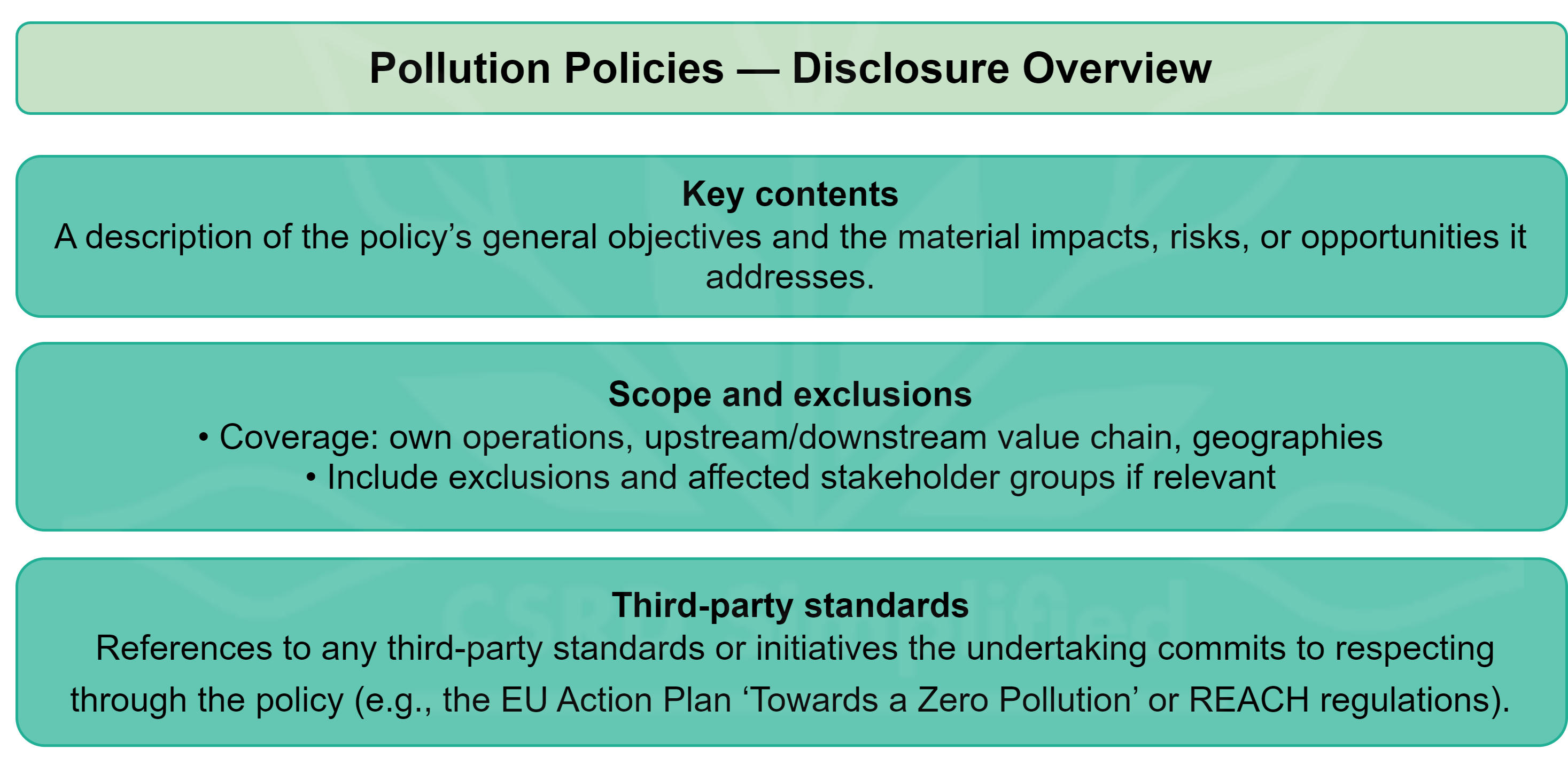 E2-1 specifically requires that “the undertaking shall disclose its pollution-related policies in accordance with the provisions of ESRS 2 GDR-P”.
