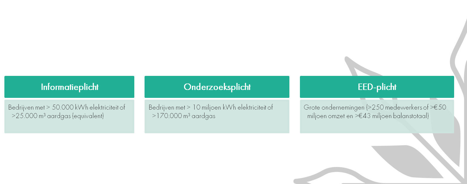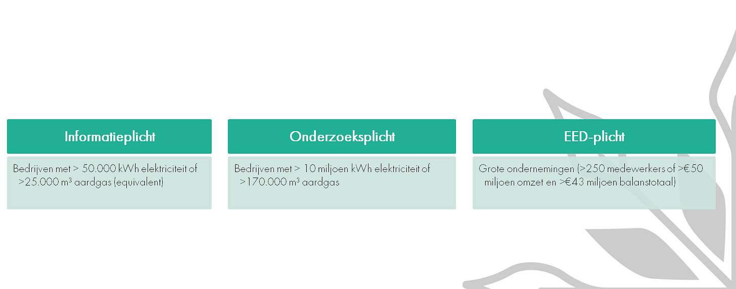 De informatieplicht is van toepassing op bedrijven die jaarlijks meer dan 50.000 kWh elektriciteit of 25.000 m³ aardgas (of een equivalent daarvan) verbruiken. Deze bedrijven moeten elke vier jaar rapporteren welke energiebesparende maatregelen zij hebben genomen.