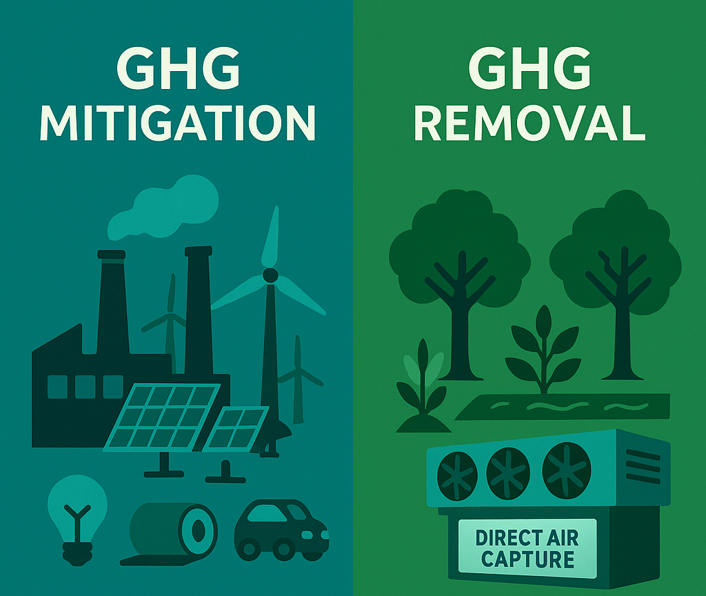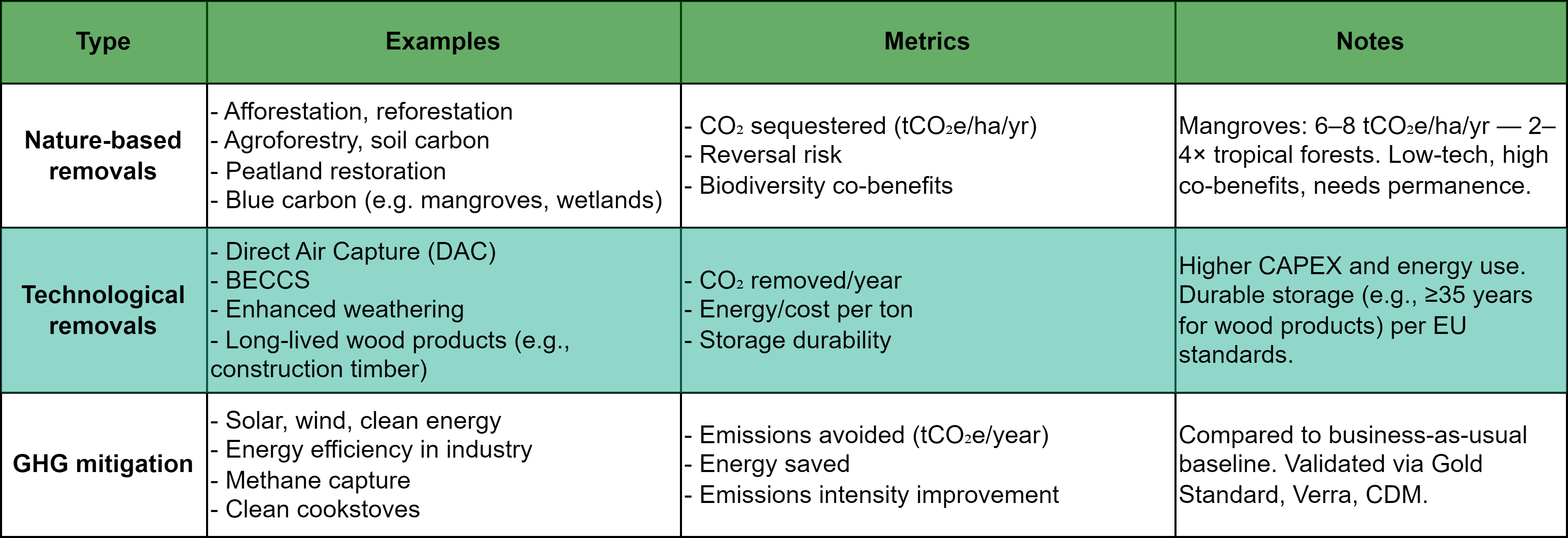GHG removals refer to processes that permanently remove greenhouse gases from the atmosphere, such as planting forests, restoring wetlands, or using engineered technologies like Direct Air Capture (DAC). These can be either nature-based (e.g. afforestation, soil carbon projects, mangrove restoration) or technological (e.g. BECCS, enhanced mineralization, or using wood in construction if it avoids decay for ≥35 years).