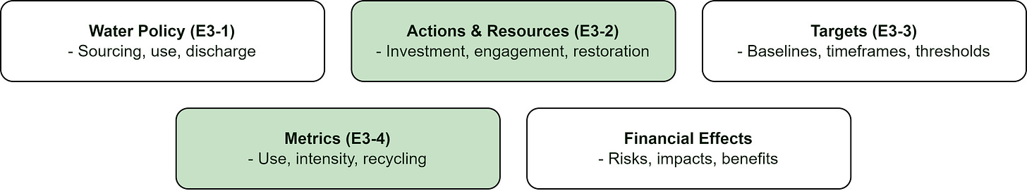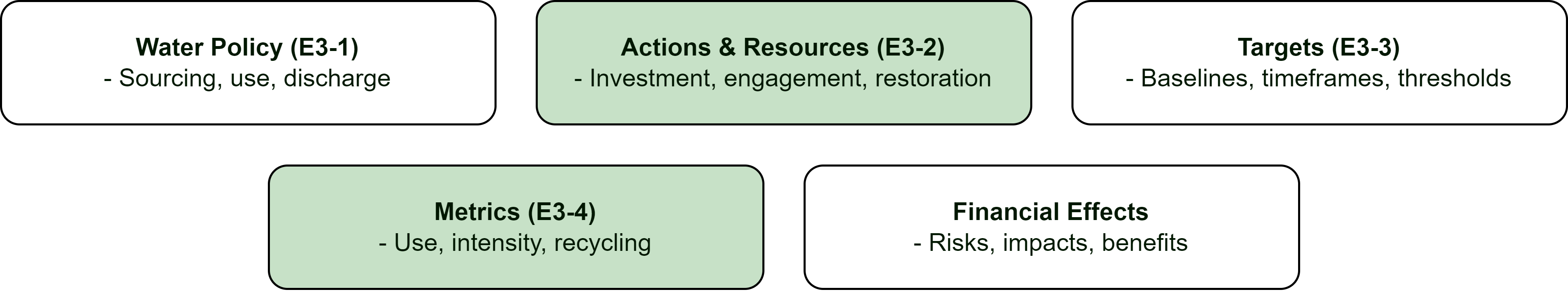 Metrics (E3-4): Tracking water consumption, recycling, and intensity (e.g., m³ per € revenue) (page 130: 6.7.2. Metrics for nature-related risks and opportunities)