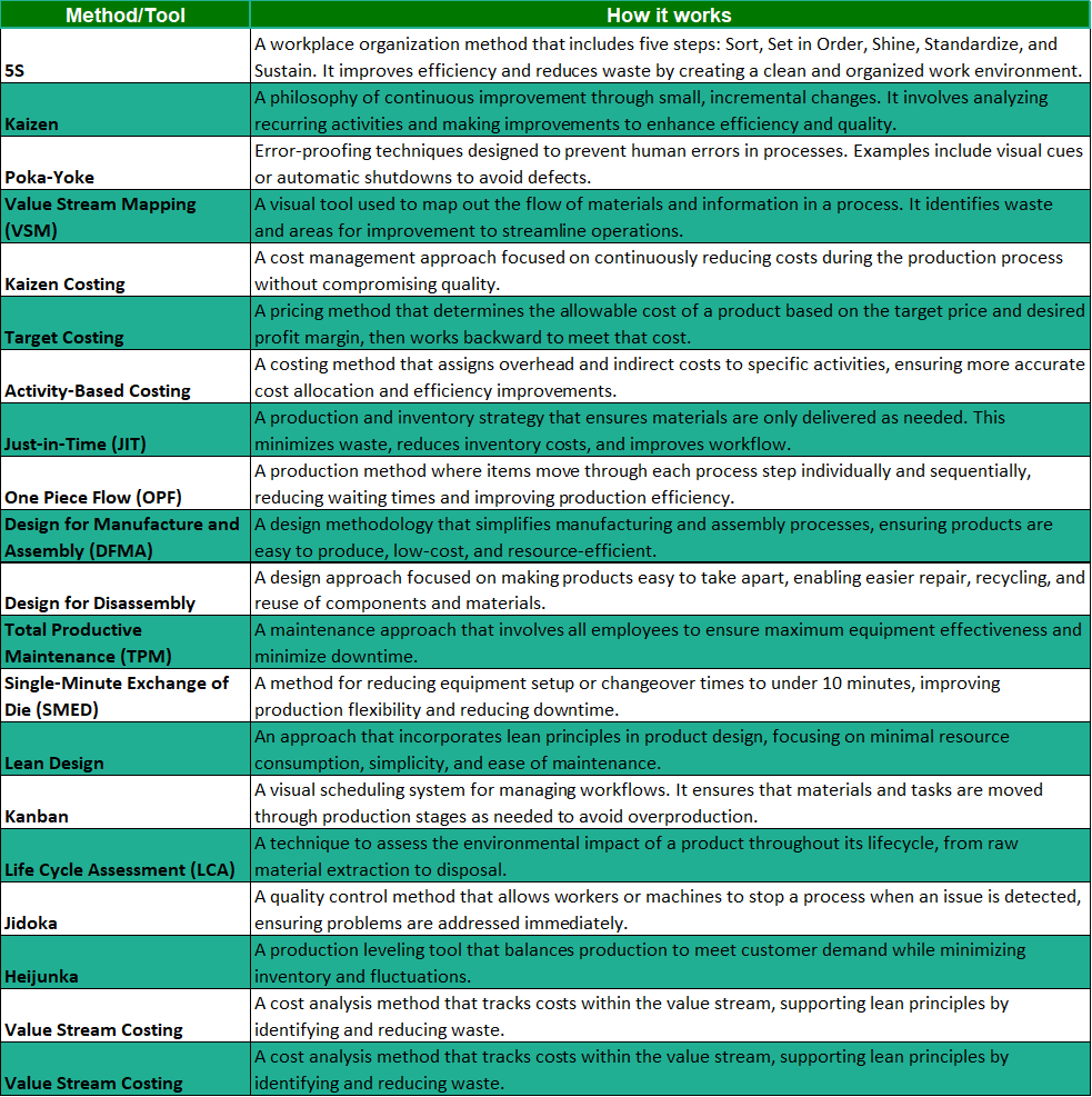 Reducing waste generation: Tools such as 5S, Kaizen, Poka-Yoke, and Value Stream Mapping (VSM) help identify and eliminate waste in production processes.