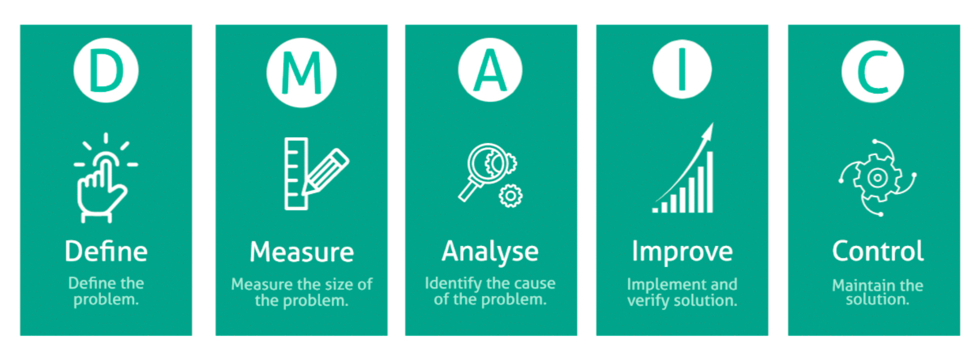 The methodology follows a structured problem-solving approach known as DMAIC: