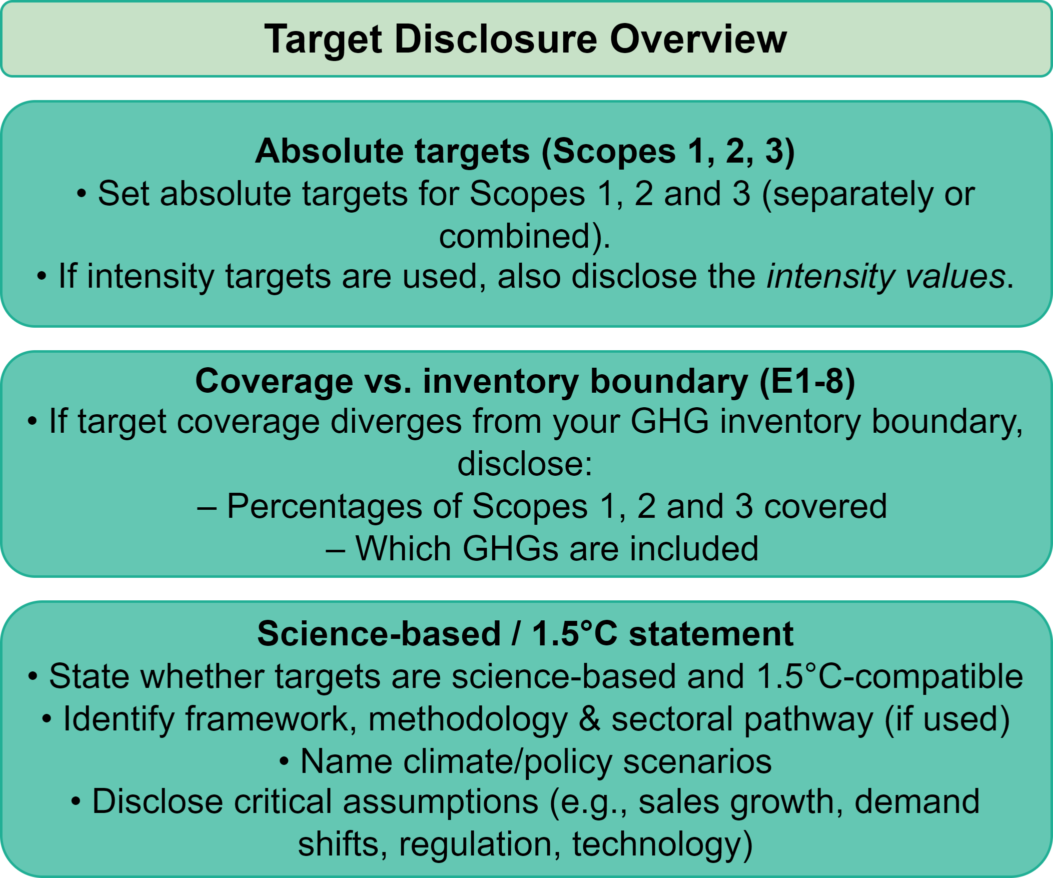 You may set intensity targets, but if you only use intensity you must also disclose the associated absolute values for the target year and interim year(s)—even if absolute emissions rise with growth.