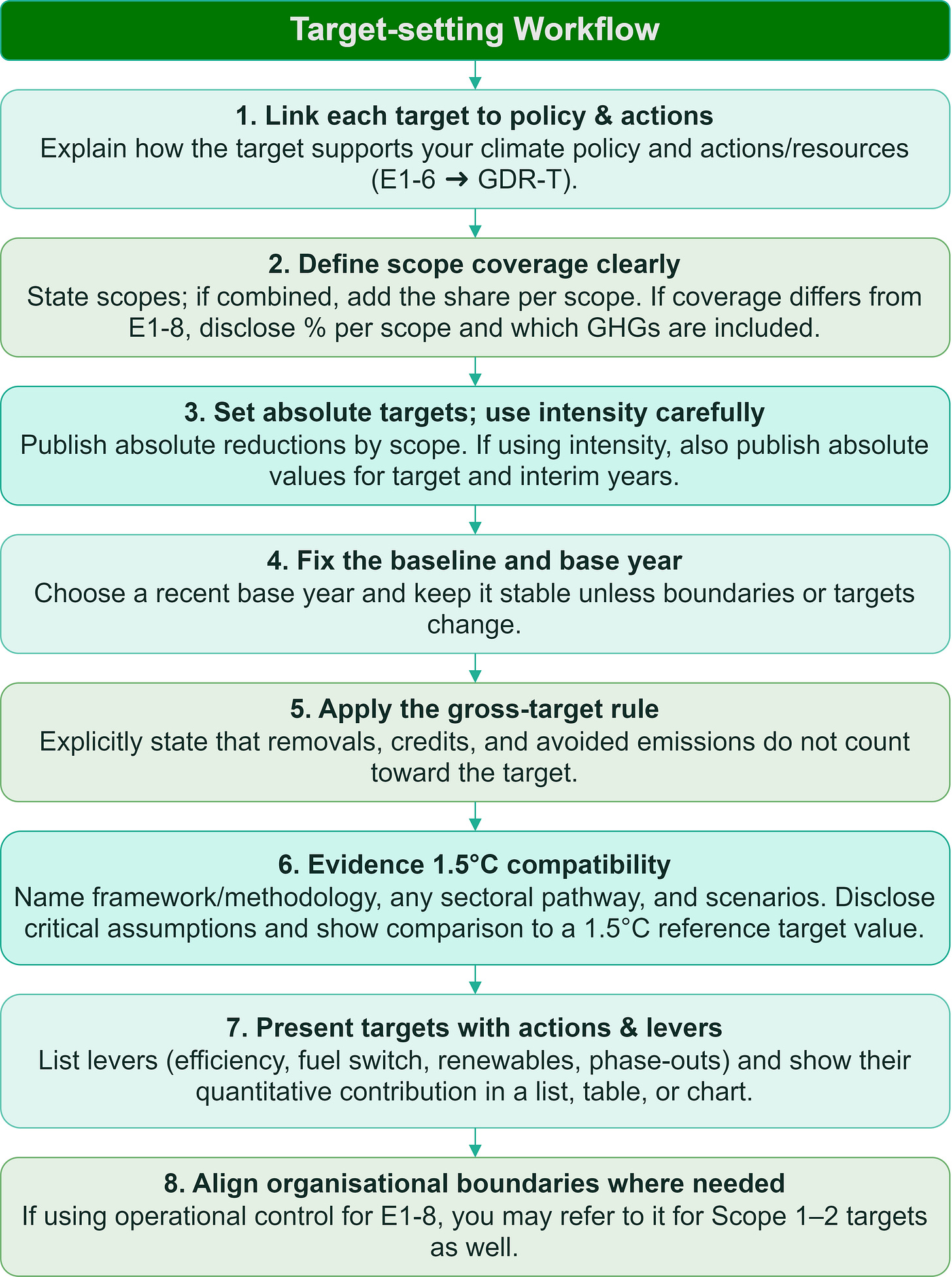 E1-6 requires you to disclose climate targets “in accordance with ESRS 2 GDR-T.” Practically, that means each target needs the basics: link to policy/actions, unit (absolute or relative), scope, baseline and base year, target year (plus milestones), methods, assumptions, and scenario references.