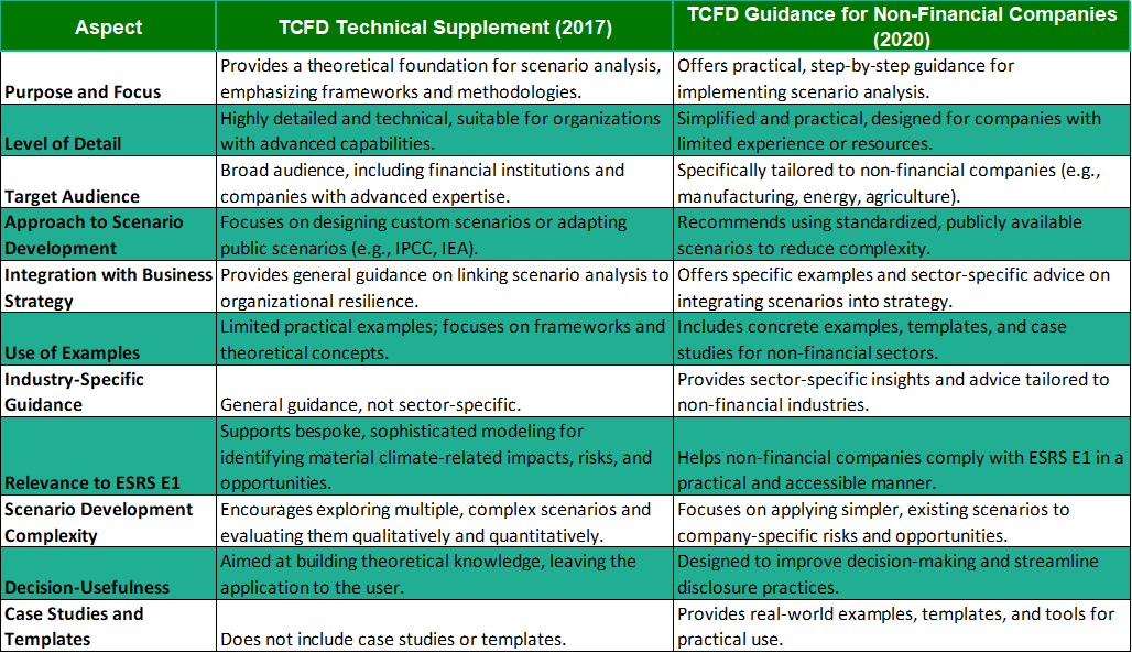 TCFD’s guidance remains a valuable reference for meeting ESRS E1 on climate-related risks and scenario analysis. Its resources, including the Technical Supplement and the Guidance for Non-Financial Companies, can help companies structure their analysis to meet disclosure expectations.