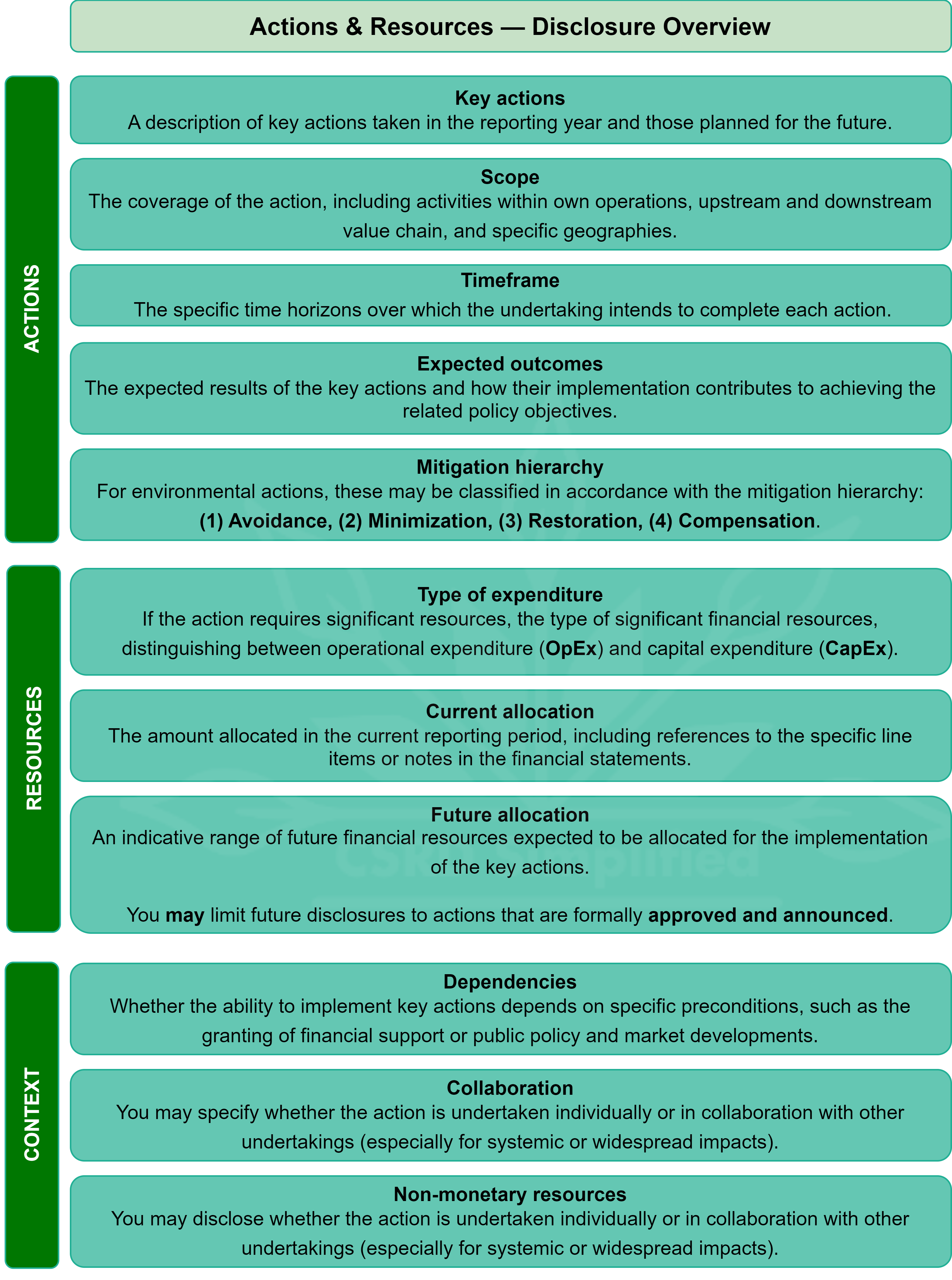 E2-2 (Actions and resources): requires reporting on the key actions taken (such as installing new filtration systems) and the financial resources (CapEx/OpEx) allocated to them.