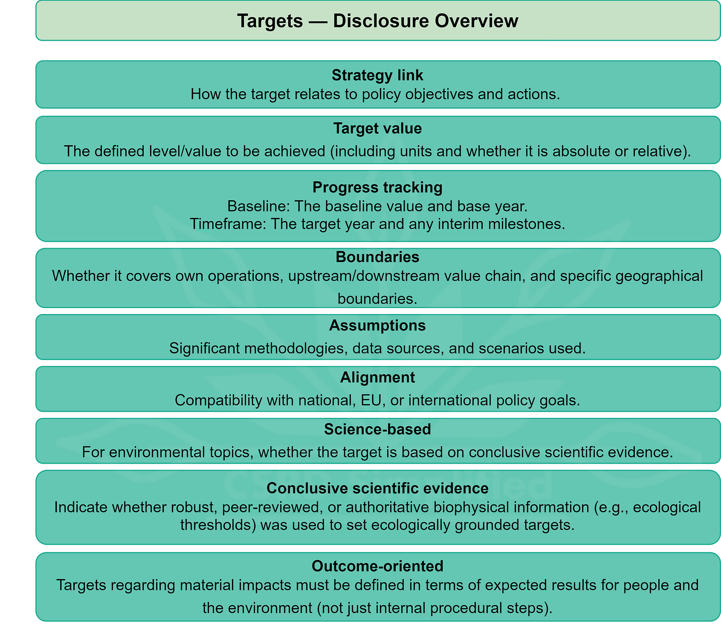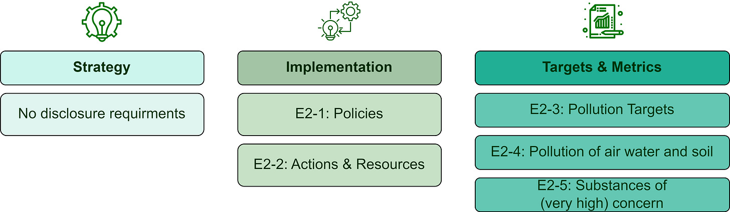 While ESRS E1 is structured around three pillars: Strategy (long-term plans, risk analysis, and resilience), Implementation (policies, actions, and resources), and Targets & Metrics (quantifiable goals, emissions data, and financial implications). ESRS E2 is structured into only two pillars: implementation (how you handle pollution) and targets & metrics (the actual numbers).