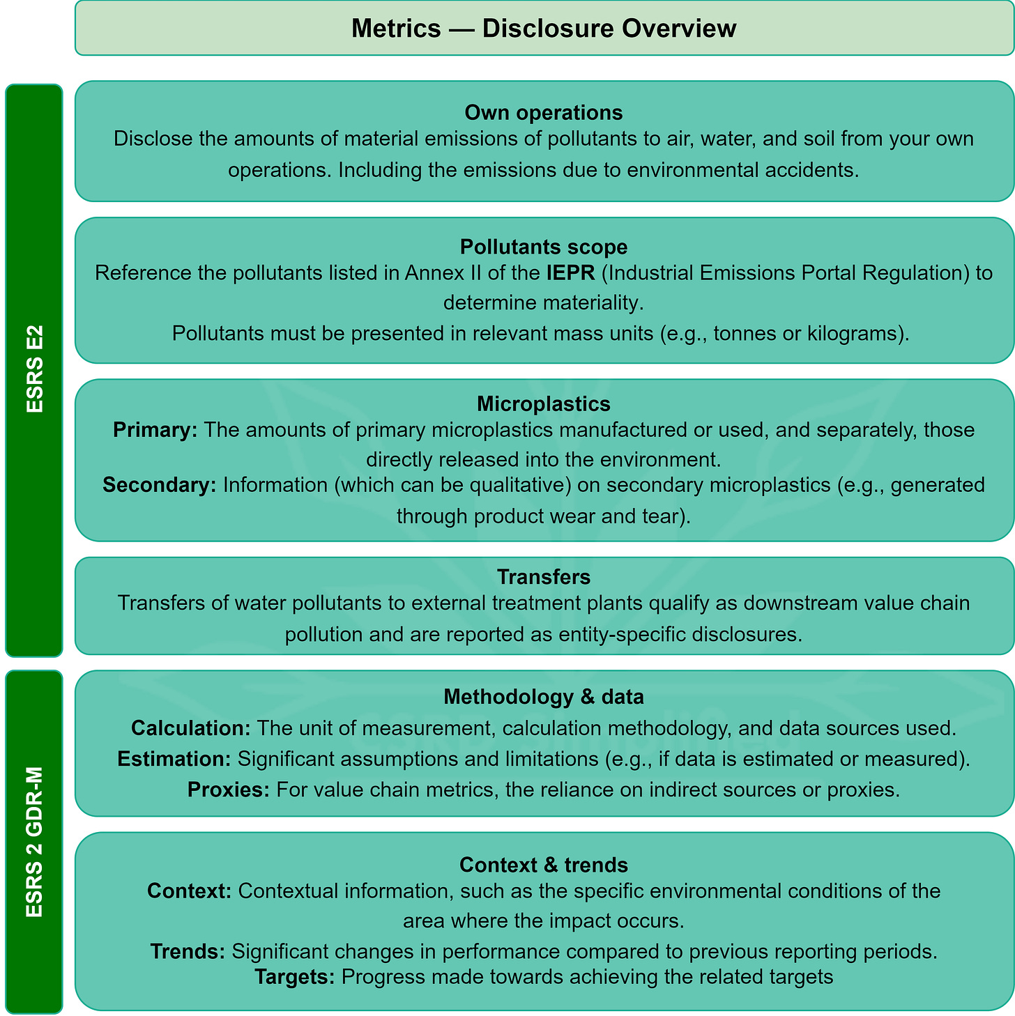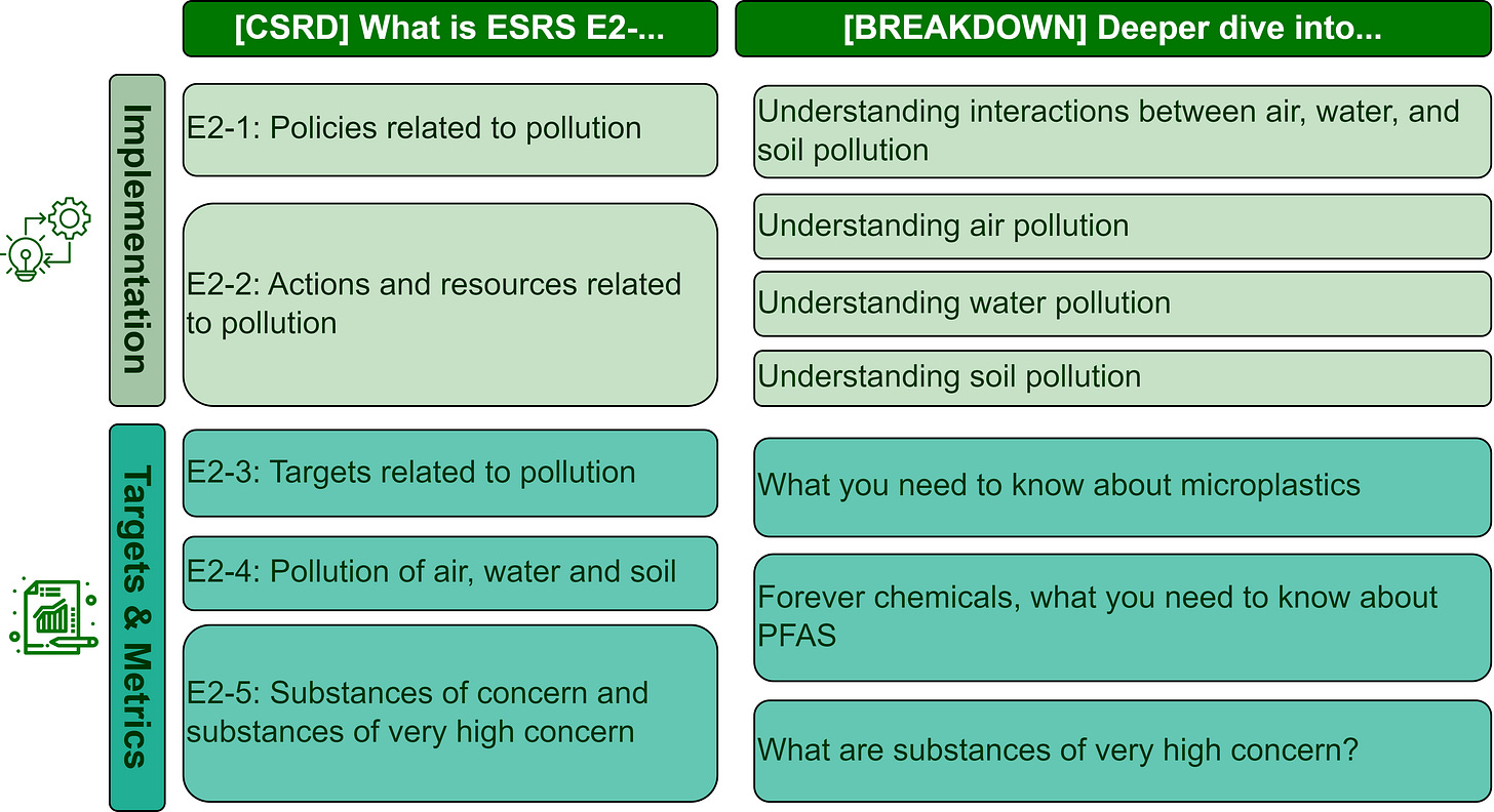 ✅ The key components of ESRS E2 (E2-1 to E2-5), from policy to microplastics