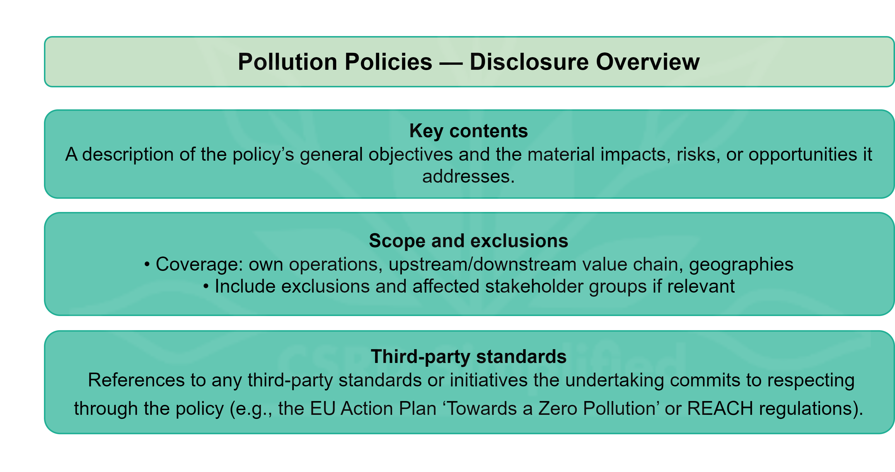 E2-1 (Policies): companies must disclose their policies for preventing and reducing pollution. The rules in ESRS 2 GDR-P frame these policies.