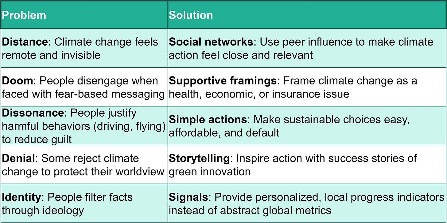 Climate change is not the kind of threat humans naturally respond to, but understanding our cognitive biases allows us to craft smarter interventions. Instead of relying on fear or guilt, we can: